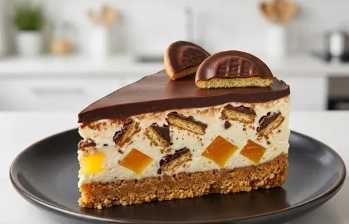 7. Dekoracija: Pred samo služenje, pažljivo skinite obruč kalupa i na vrh torte stavite one Jafa kekse koje ste sačuvali, prerezane na pola (kao na fotografiji).