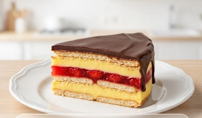 Da biste dobili ovako besprekorne slojeve kao na fotografiji, ključno je ispraviti par nelogičnosti sa originalne liste sastojaka. Šećer je apsolutno neophodan za kuvanje pudinga, a za voćni žele nam je potrebna voda kako bismo dobili pravu teksturu. Uz malo strpljenja prilikom hlađenja svakog sloja, vaša torta će izgledati kao iz elitne poslastičarnice!