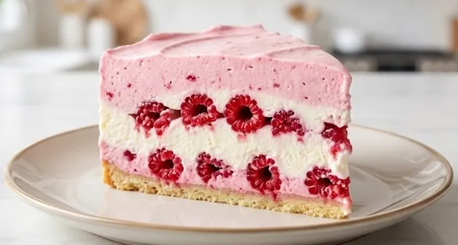 Dobrodošli! Danas pripremamo neverovatno osvežavajuću i brzu tortu sa malinama bez pečenja. Kada pažljivo pogledamo presek na fotografiji, jasno vidimo prelepe i uredne slojeve. Tu je tanka podloga od keksa, zatim roze krem sa celim komadima malina, pa debeli beli krem u sredini, i na kraju ponovo roze krem na vrhu. Da bismo dobili tačno ovakav vizuelni efekat sa dva različita krema od istih sastojaka, naš osnovni fil ćemo podeliti, a deo malina ćemo izgnječiti za boju. Hajde da napravimo ovu lepoticu korak po korak!