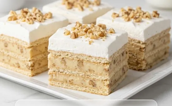 5. Završni sloj, dekoracija i hlađenje: Umutite 200ml hladne slatke pavlake u čvrst šlag. Nanesite šlag preko gornjeg sloja keksa i špatulom ga savršeno poravnajte. Bogato pospite onim sačuvanim seckanim orasima. Tortu obavezno stavite u frižider na najmanje 5 do 6 sati (idealno preko noći) kako bi keks omekšao i povezao se sa filom u jednu celinu.