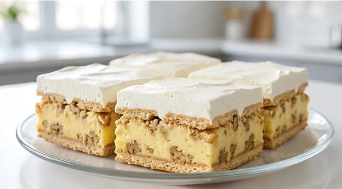 Dobrodošli! Danas pripremamo čuvene brze grčke kocke. Gledajući fotografiju ovog predivnog deserta, jasno vidimo savršene slojeve hrskavog petit keksa i izuzetno bogatog, žutog fila od vanilije koji je upotpunjen krckavim komadićima oraha. Na samom vrhu se nalazi raskošan sloj belog šlaga koji ovoj torti daje laganu i vazdušastu teksturu. Ovaj kolač se ne peče, priprema je veoma brza i jednostavna, a ukus je apsolutno neodoljiv. Hajde da ga napravimo zajedno korak po korak!