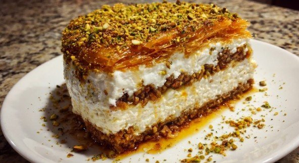 Posebna egejska mešavina začina koja sadrži mastiku, majčinu dušicu, limun i cimet, prožima svaki zalogaj aromama obala Grčke i Turske. Slojevi puterastih kora, začinjenih oraha i svilenkastog čizkejka peku se do zlatne boje, a zatim natapaju mirisnim medenim sirupom. Pogledajte samo taj neverovatan presek sa savršenim slojevima krem sira, oraha i hrskavih kora na fotografiji! Krenimo na pripremu ovog remek-dela.