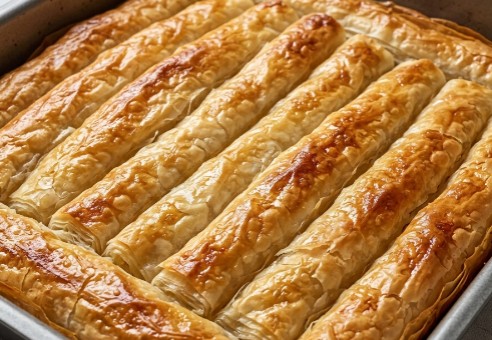 4. Slaganje i zalivanje: Četvrtasti pleh obložite papirom za pečenje (ili ga blago podmažite uljem). Slažite rolne jednu do druge, baš kao na fotografiji. Kada poređate sve rolne, ako vam je ostalo premaza od kisele vode i ulja, obavezno ga ravnomerno prelijte i premažite preko cele pite. (Trik: Ako vam je ostala kašika fila, umešajte je u taj premaz i prelijte – to daje onu nestvarnu zlatnu boju!).