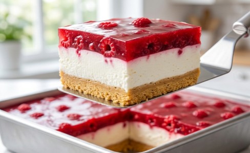 Tajna njegovog besprekornog preseka (kao na fotografiji) leži u strpljivom hlađenju svakog sloja. Čvrsta keks baza drži vazdušasti beli oblak od krema, dok krunu celog deserta čini jarko crveni žele pun celih komada malina. Savršen je za tople dane, rođendane ili nedeljno popodne sa porodicom!