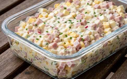Bilo da je pripremate kao deo bogatog predjela za goste, ili kao samostalni obrok uz prepečen hleb, ova kremasta salata je uvek pun pogodak. Praška šunka daje finu dimljenu notu, tvrdi sir donosi punoću, a rotkvice su zadužene za osvežavajuću hrskavost koja razbija monotoniju.