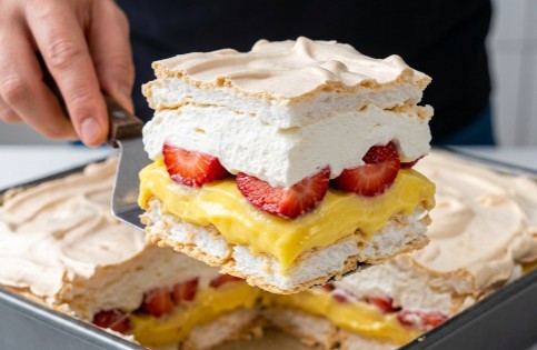 Fotografija pokazuje savršenu kocku, što znači da je kolač dobro ohlađen i da su kore pažljivo ispečene (odnosno osušene). Iako se najčešće pravi sa jagodama, kivi i banane su takođe odličan izbor, a ovaj recept vam garantuje presek kao iz vrhunske poslastičarnice!