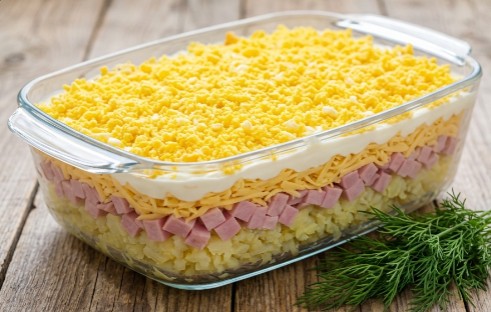 Tajna savršene Mimoze krije se u prozirnoj staklenoj posudi koja omogućava da se vide svi predivni, šareni slojevi (kao na fotografiji). Kombinacija vazdušasto rendanog krompira, kockica šunke i kačkavalja, povezanih laganim prelivom od majoneza i pavlake, stvara harmoniju tekstura i ukusa koja će oduševiti sve vaše goste.