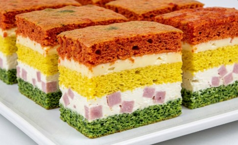 Iako deli DNK sa šarenim slanim rolatom, ova torta pruža potpuno drugačiji doživljaj i estetski izgleda još moćnije kada se iseče na savršene kocke. Kombinacija prirodnih boja od spanaća i ajvara, uz žuti biskvit od samih jaja, stvara predjelo koje mami poglede.