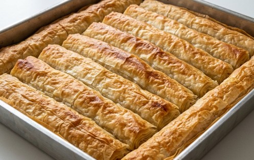 Korak 5: Sečenje i prelivanje Ponavljajte postupak dok ne iskoristite sve kore i fil. Kada su svi rolati u plehu, isecite ih oštrim nožem na komade željene veličine. Zatim ceo preostali tečni preliv ravnomerno sipajte preko isečenih rolata.