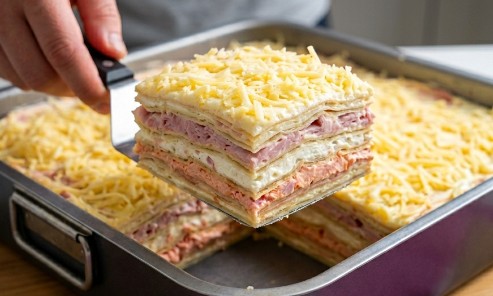 Korak 5: Završna dekoracija i hlađenje Poslednju praznu koru na samom vrhu torte premažite veoma tankim slojem majoneza i celu površinu bogato pospite sitno narendanim kačkavaljem. Tortu odozgo ravnomerno pritisnite nečim težim poput drvene daske i ostavite je u frižideru preko noći. Kore moraju da prenoće kako bi potpuno omekšale i upile sve ukuse. Sutradan oštrim nožem isecite tortu na savršene kocke i poslužite. Prijatno!