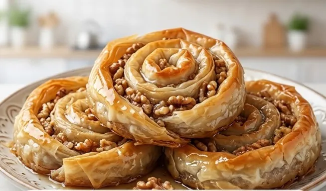 Dobrodošli! Danas pripremamo predivne starinske ružice sa orasima. Gledajući fotografiju ovog sočnog deserta, jasno vidimo hrskave slojeve kora savijene u oblik puža ili ružice, bogato ispunjene krupnijim komadima oraha i savršeno natopljene sjajnim sirupom. Iako u spisku sastojaka piše mleveni orasi, deo oraha ćemo ostaviti krupnije seckanim kako bismo dobili tačno ovakav prelep i autentičan izgled. Hajde da napravimo ove sočne lepotice korak po korak!
