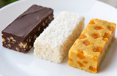 Zahvaljujući neutralnoj, puterastoj bazi od keksa, veoma je lako igrati se ukusima. Prvi deo postaje bogata čokoladna poslastica sa krckavim orasima, drugi deo se pretvara u nežne, snežno bele kokos kocke, dok treći deo, obogaćen suvim kajsijama i sokom od pomorandže, donosi predivnu osvežavajuću voćnu notu.