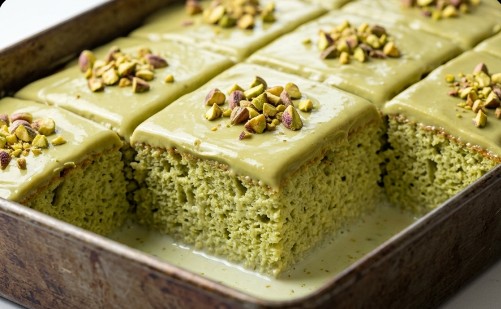 Ovaj predivni zaliveni kolač sa pistaćima predstavlja pravi kraljevski desert neverovatne sočnosti. Biskvit koji miriše na orašaste plodove savršeno upija mleko i topi se pri svakom zalogaju.